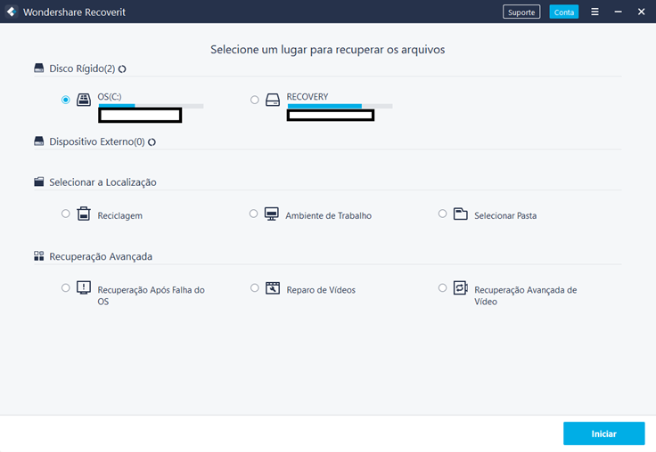 Para começar, baixe e instale o software no seu computador. Depois, é só abrir o Recoverit e seguir as etapas abaixo para recuperar fotos, vídeos e outros documentos: